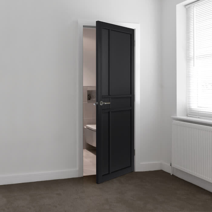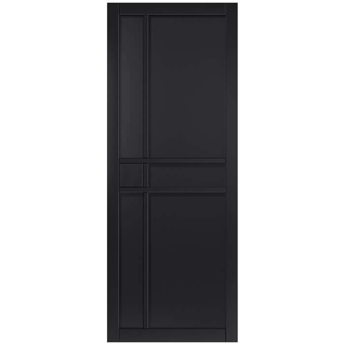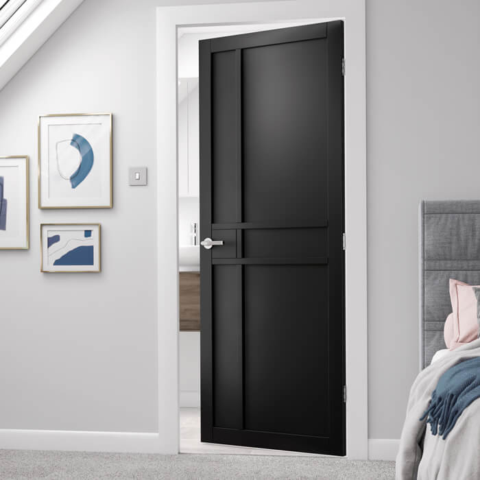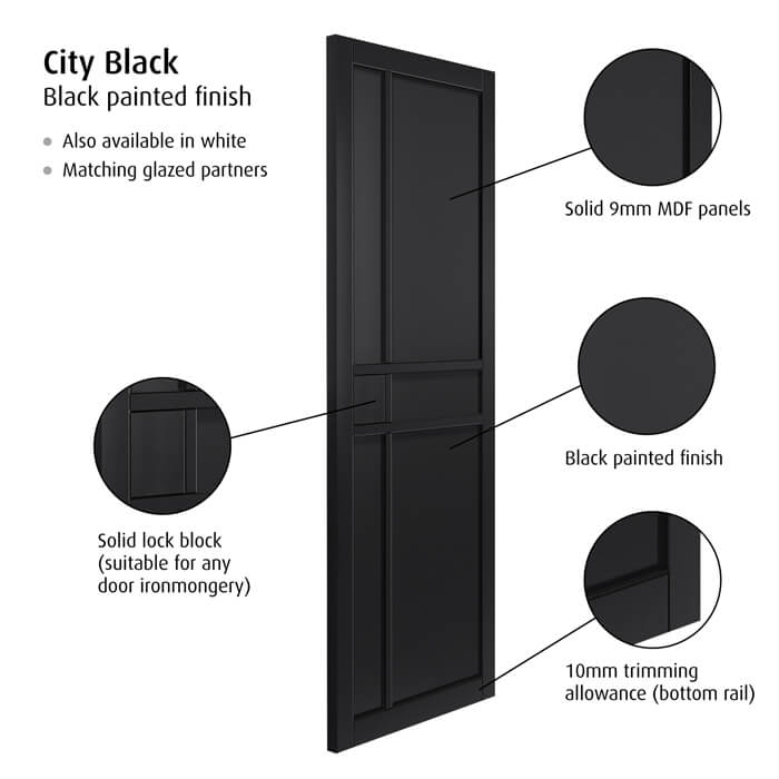 The JB Kind City Black Industrial Style door offers a contemporary panel design, perfect for industrial-style interiors. These doors in the City series are becoming indispensable for interior designers as homeowners seek a more modern and unified look. With its black painted finish and sturdy construction lock blocks, the City door is suitable for use with standard handles, latches, and hinges. Plus, a 10mm trimming allowance on the bottom rail makes for effortless customization during installation.
