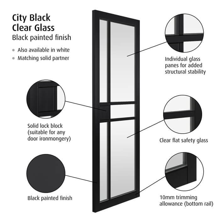 The JB Kind City Glazed Black Industrial Style door offers a contemporary panel design, perfect for industrial-style interiors. These doors in the City series are becoming indispensable for interior designers as homeowners seek a more modern and unified look. With its black painted finish and sturdy construction lock blocks, the City door is suitable for use with standard handles, latches, and hinges. Plus, a 10mm trimming allowance on the bottom rail makes for effortless customization during installation.