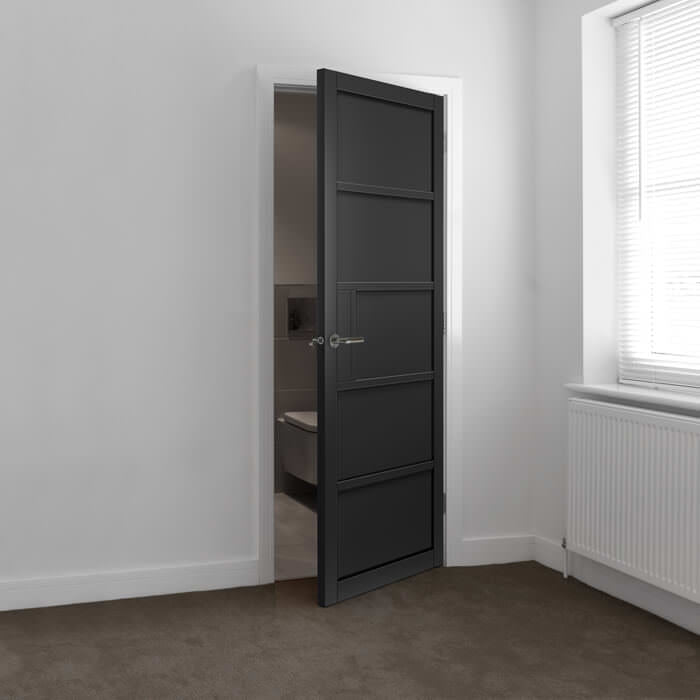 The JB Kind 5 Panel Urban Industrial Metro Black Ladder-Style Internal Door embodies modern industrial flair with its sleek black design and captivating recessed panels. Ideal for industrial-style homes, flats, and apartments, this contemporary ladder-style door boasts solid construction and can easily accommodate regular handles, latches, and hinges without the need for specialised hardware.