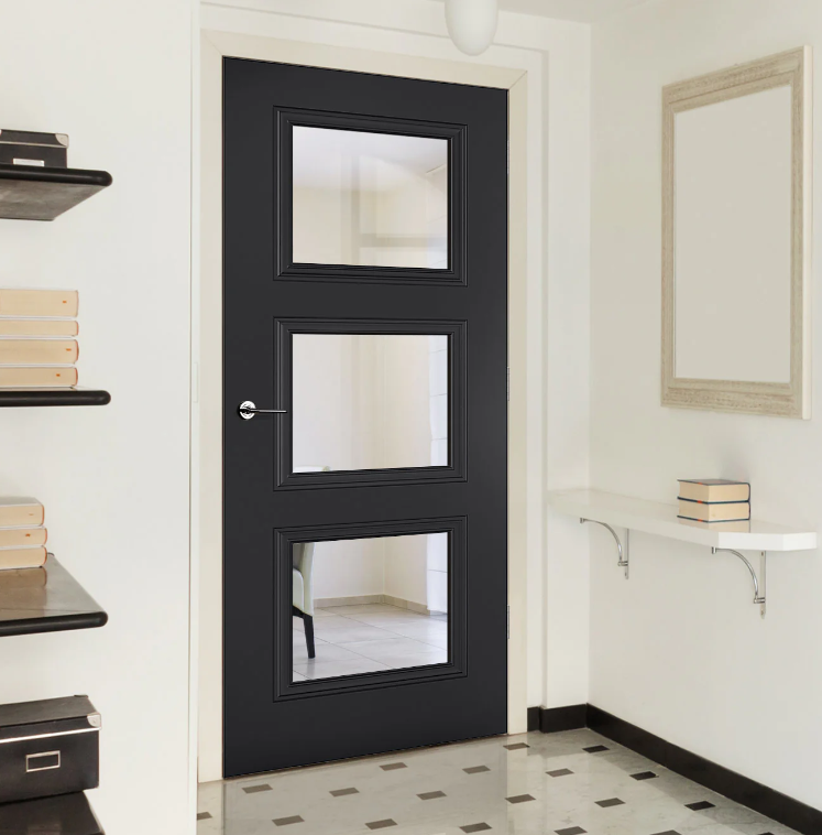 The LPD Antwerp Glazed 3L Black Primed Internal Door arrives primed for painting, providing an exceptional option for homes with a classic ambiance. Its unique design sets it apart. With its bold and stylish primed black color, this door adds a touch of grandeur to your home. Enhanced with bolection moulding, it not only adds aesthetic appeal but also allows natural light to flow throughout your space. The arrangement of three square clear glazed windows makes this door a standout feature in your interior décor.