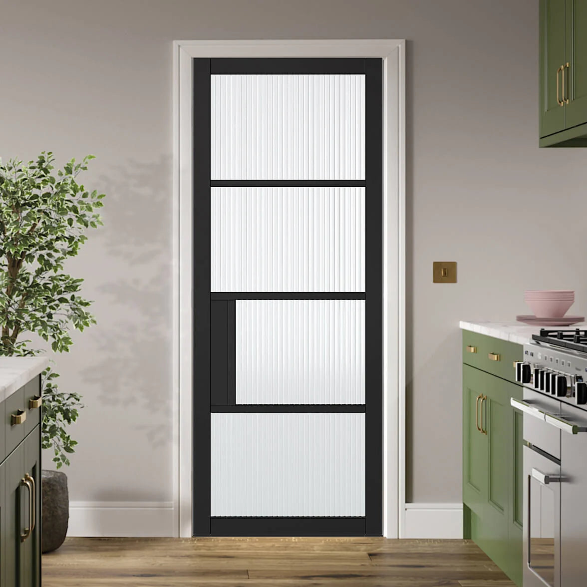 - Style: Industrial Style, Modern Black door featuring four Reeded glazed panels with decorative beading