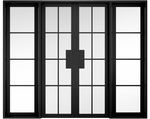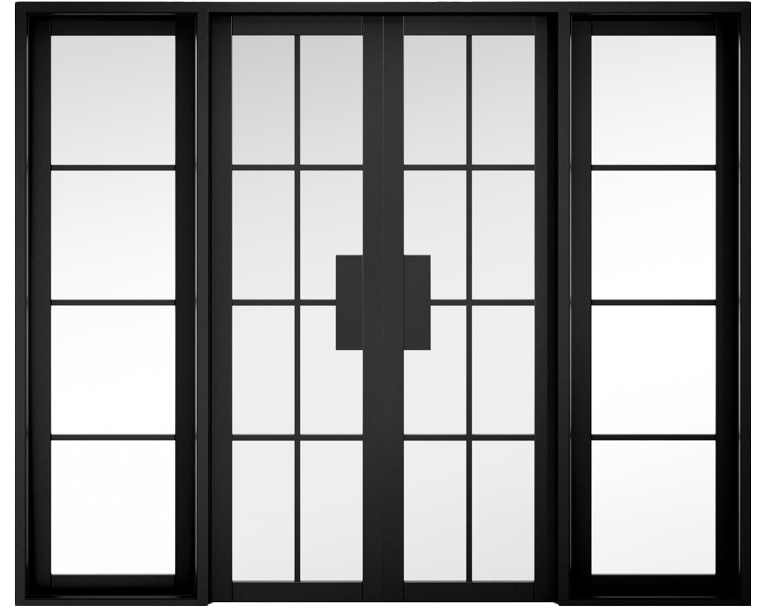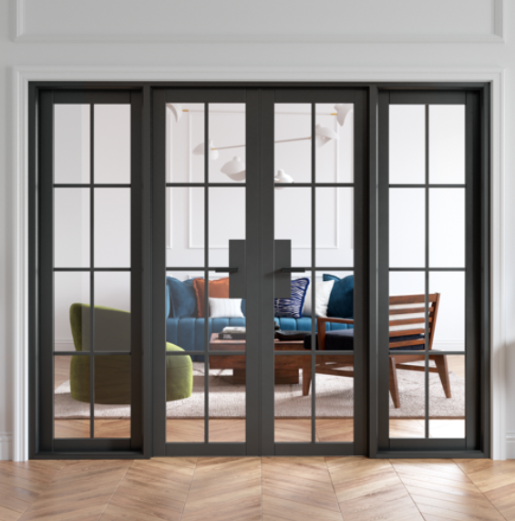 The set includes two solid core doors and two side panels, all pre-primed in a striking black finish and featuring clear toughened glass for a combination of strength, safety, and style. Each door and panel measures 579mm in width, and together with the 133mm deep black primed frame and pair maker, the complete frame measures 2478mm wide by 2031mm high.
