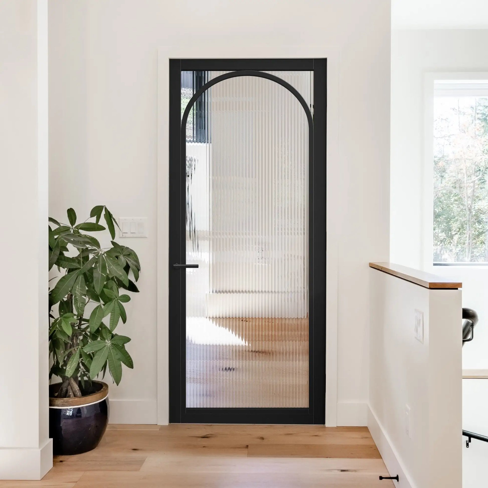 - Style: Industrial Style, Modern glazed door with sleek arched top design