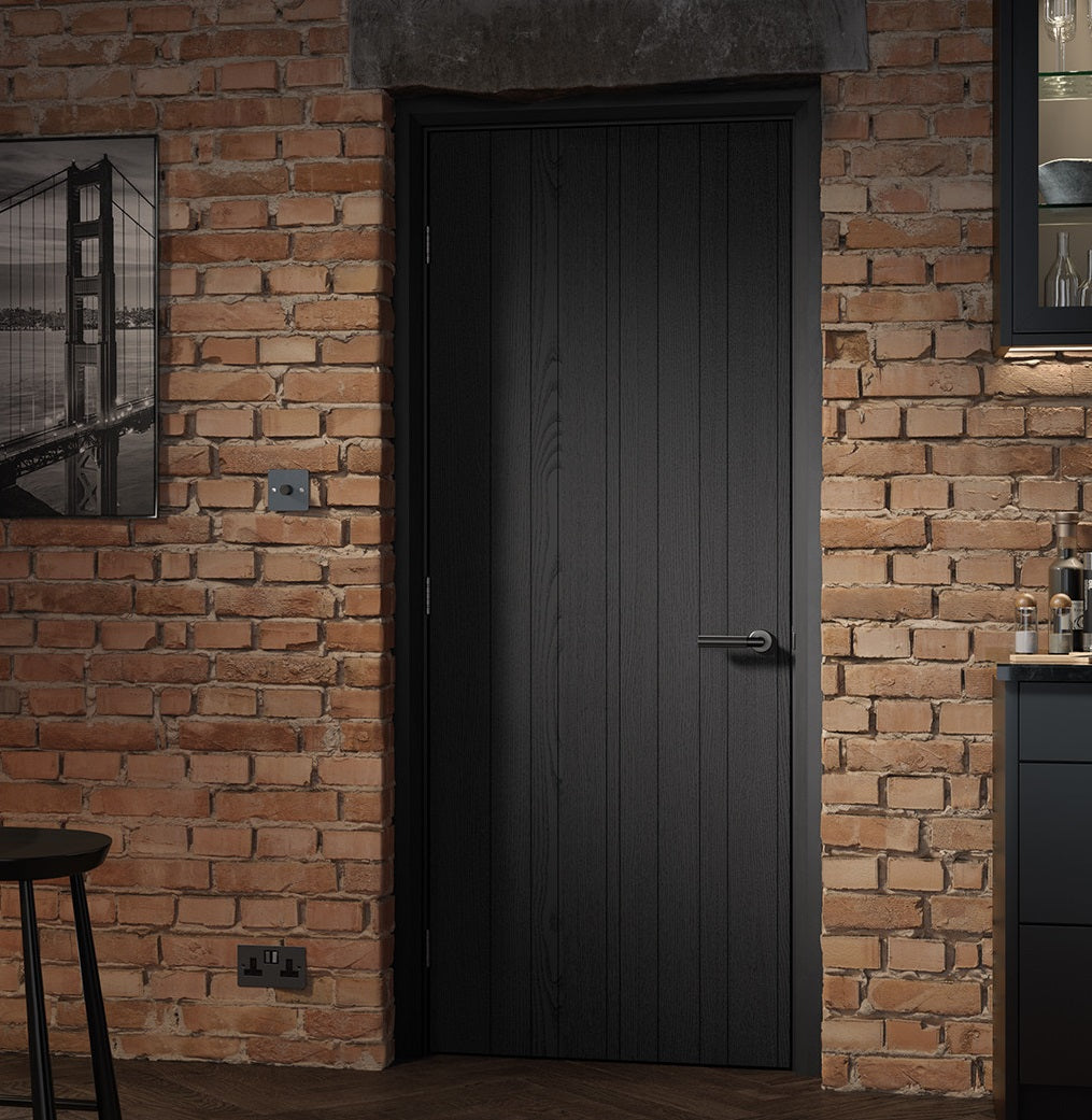 The LPD Montreal Dark Charcoal Oak Internal Door. Arriving in a pre-finished Dark Charcoal hue, this internal door offers a hassle-free solution as it comes ready for installation. The Montreal showcases a geometrically styled pattern of square-cut vertical grooves, distinguishing it as a truly unique addition. Tailored for modern homes, this door is prepared to become a standout feature within your interior, enhancing its contemporary appeal.