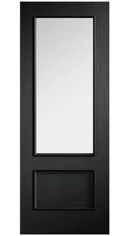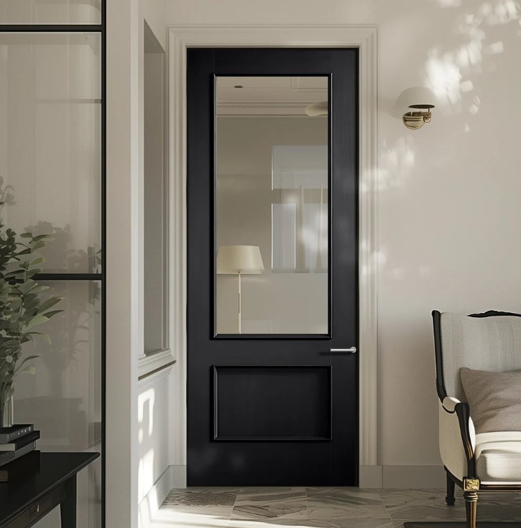 The LPD Murcia Glazed Traditional Black Internal Door arrives ready for installation, fully finished, making it an excellent choice for homes with a classic vibe. Featuring a large clear glazed panel above and a smaller solid panel below, the Murcia Glazed combines traditional design with modern elements. Its trendy Charcoal Black finish, enhanced by a natural wood grain texture, adds sophistication. This internal door's timeless style with a contemporary twist will elevate the ambiance of any home.
