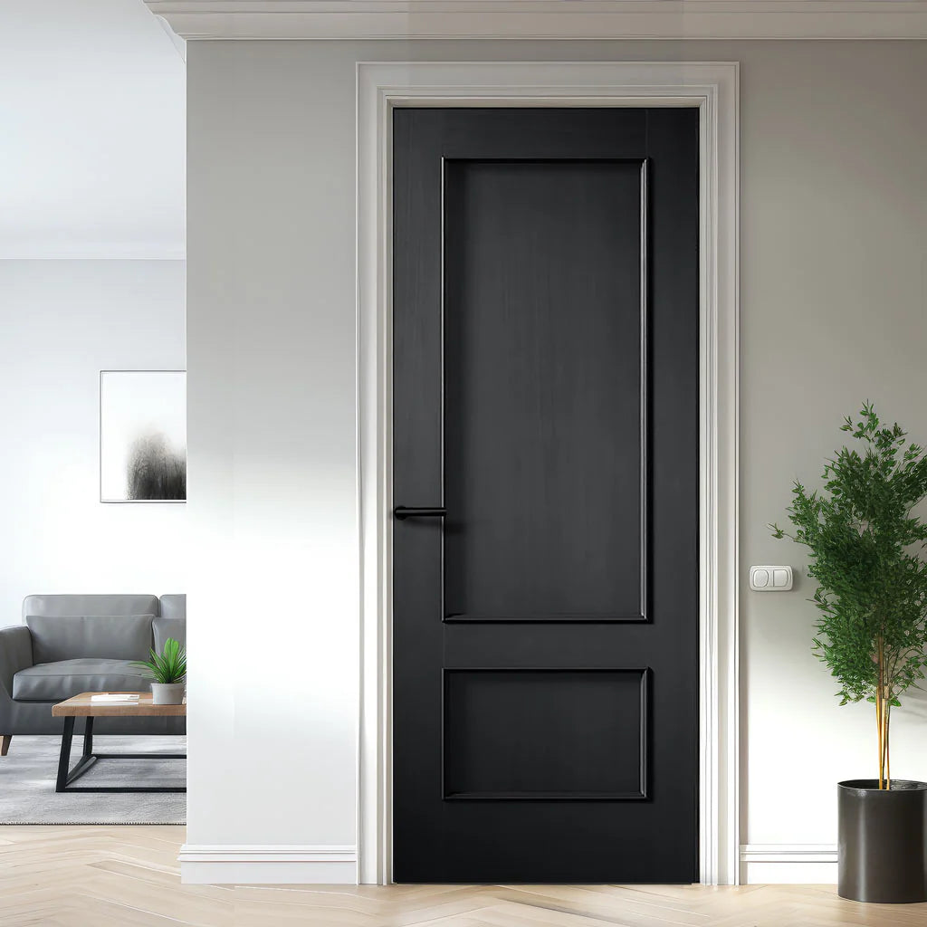 The LPD Murcia Traditional Black Internal Door comes ready for installation, already finished, making it perfect for homes with a traditional aesthetic. With its classic black appearance and two panels highlighted by raised bolection mouldings, the Murcia exudes timeless charm. Its natural wood grain finish adds to its appeal. Versatile and stylish, the trendy black color choice ensures a striking presence in any home.