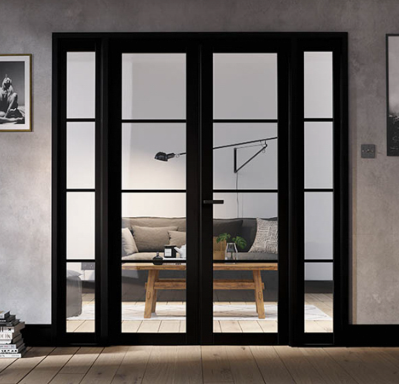 These modern and elegantly stylish Crittall-style glazed internal French doors come in standard sizes and are supplied in kit form, ready for installation by your joiner. The Black Soho W6 Room Divider features narrow door stiles, rails, and a chic beaded glazing design, giving the doors a contemporary edge, making them a top choice among interior designers.