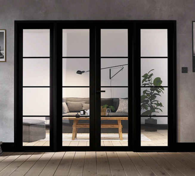 These modern and elegantly stylish Crittall-style glazed internal French doors come in standard sizes and are supplied in kit form, ready for installation by your joiner. The Black Soho W8 Room Divider features side doors, rails, and a chic beaded glazing design, giving the doors a contemporary edge, making them a top choice among interior designers.