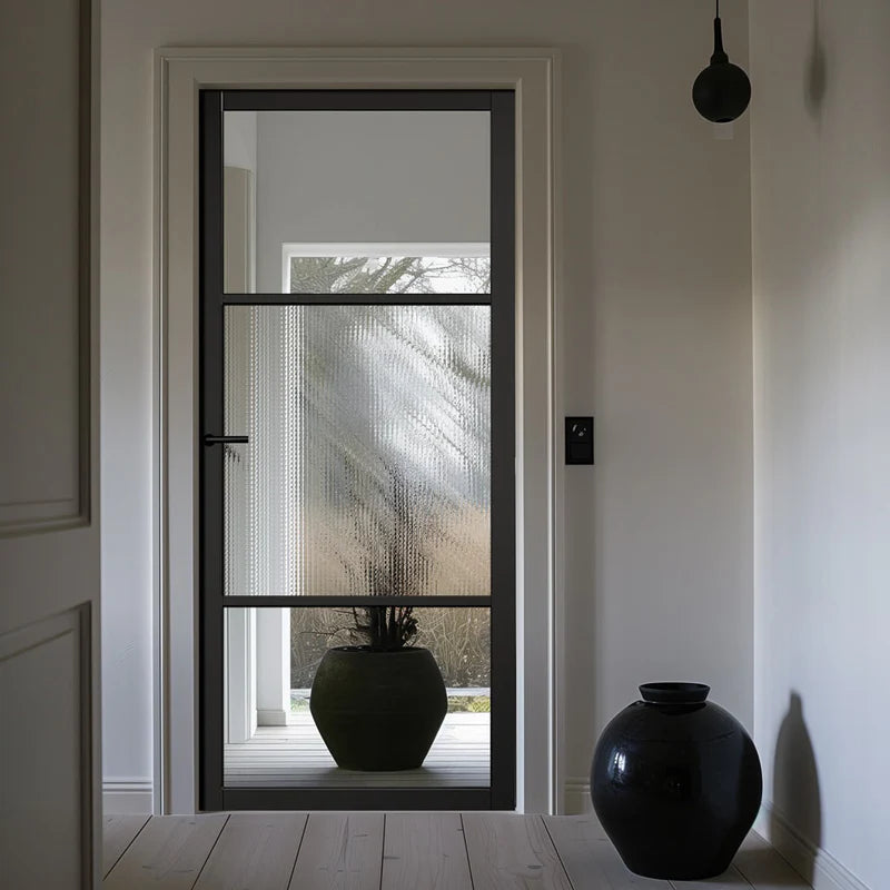 The LPD Sutton Reeded Glazed Black Internal Door offers a sleek, pre-finished black design with an industrial flair. Its distinctive feature is a cross-reeded glazed center panel, giving the door a modern twist on the classic industrial style. With its contemporary black profile, this door enhances any interior with a sophisticated touch. Please note that it must be installed with LPD's Manhattan internal hardware.