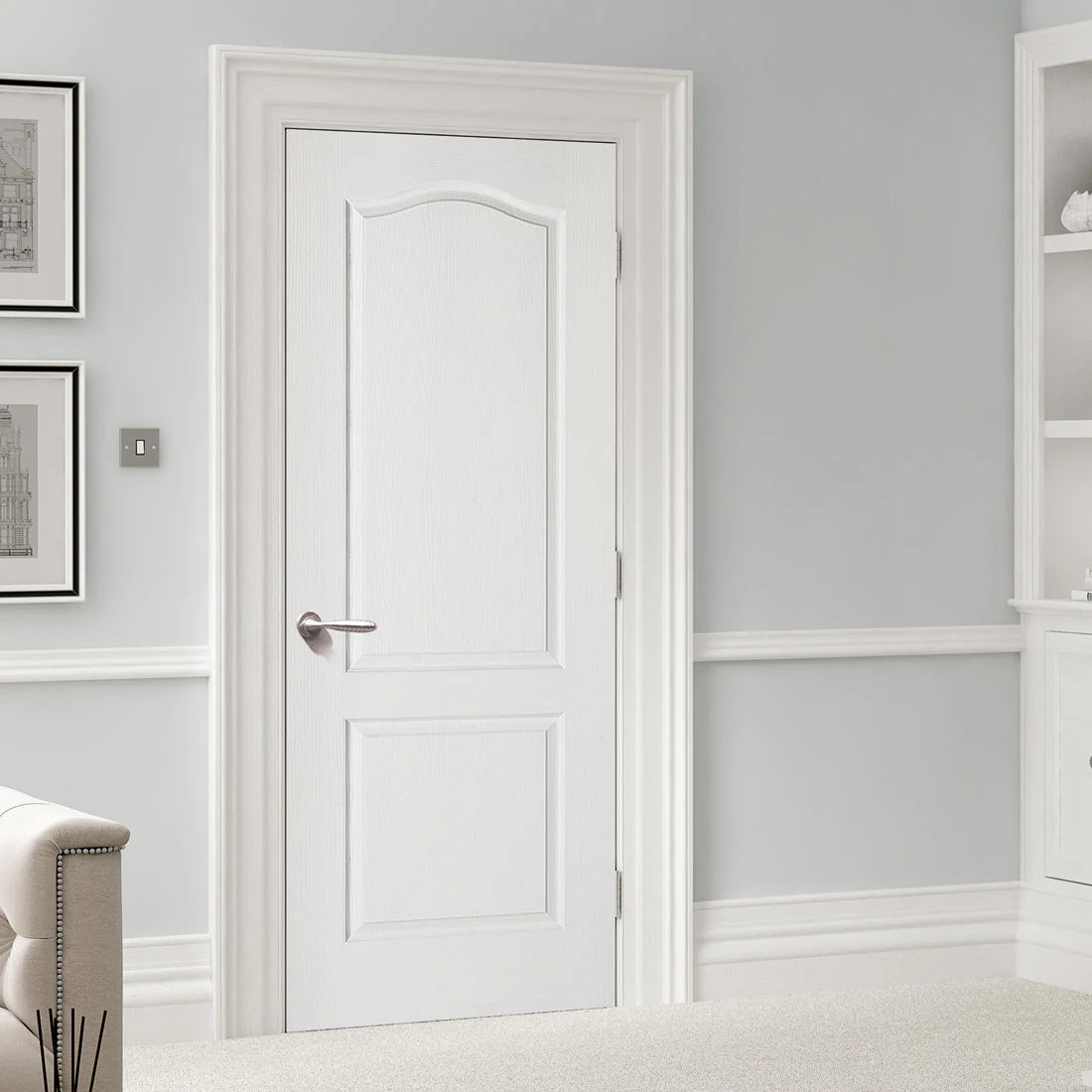 - Style: Classical door featuring two raised shaped panels with an attractive curved top edge
