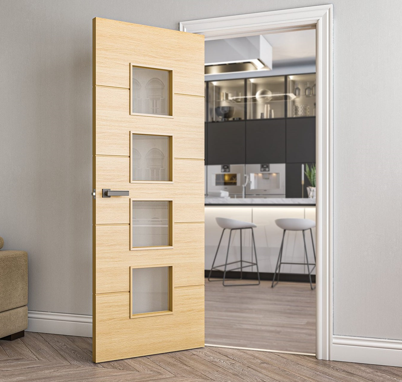 The Deanta Augusta Clear Glazed Oak FD30 Fire Door arrives Pre Finished. Bring light into your space with the Deanta Augusta oak glass door, combining modern design and warm oak tones. The Deanta Augusta prefinished oak internal door with glass features a large clear glass panel to brighten any interior. Crafted from premium oak veneer and finished in a smooth lacquer, this contemporary door adds style and functionality to any modern home. Ideal for open-plan living or connecting rooms, it balances light flow with solid oak detail.