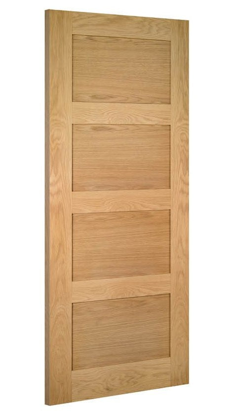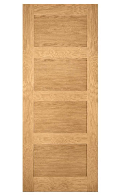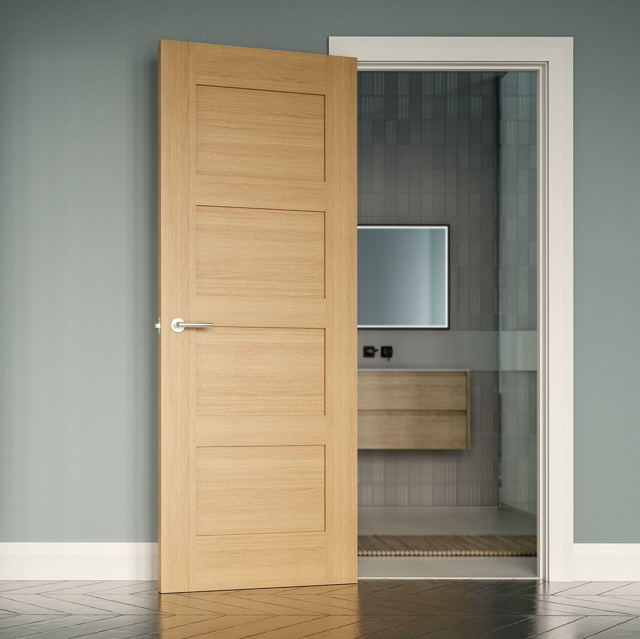 The Coventry oak door is equally at home in a farmhouse, cottage, apartment, newbuild, or townhouse. The minimalist style of this door is at once traditional and contemporary; striking and understated; rustic and sleek. The solid door features four evenly sized panels of crown-cut oak veneer within a simple veneer surround.