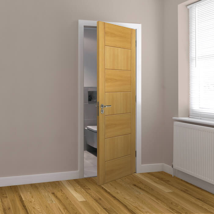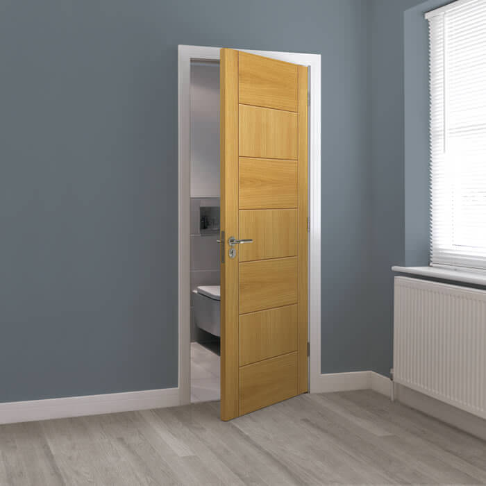 The JB Kind 7 Panel Sirocco Pre-Finished Oak Internal Door is a strikingly modern interior door with a grooved panel effect and alternating horizontal and vertical oak veneers. Supplied fully finished and ready varnished, the Sirocco has a decorative grooved panelled effect that will suit any contemporary home, flat or apartment.