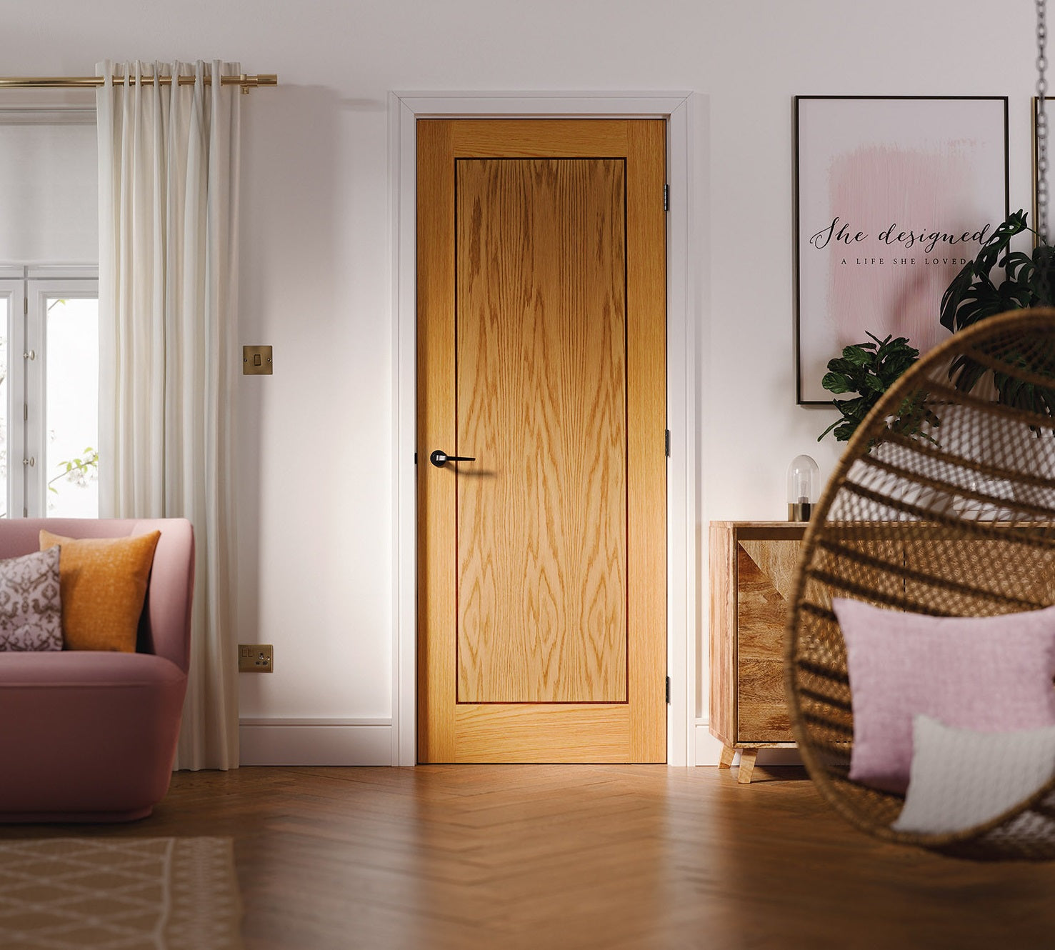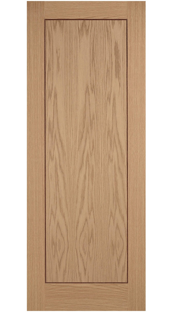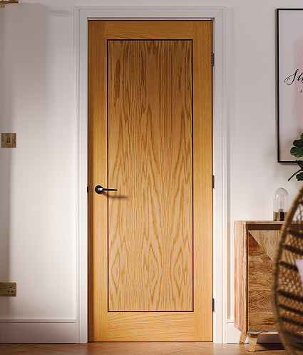 The LPD Inlay Oak 1 Panel Internal FD30 Fire Door is delivered pre-finished, ready for installation. With its modest yet versatile design, the Inlay 1P features a center panel framed by grooves, showcasing the charming pre-finished Oak wood grain accented with a Walnut Inlay.