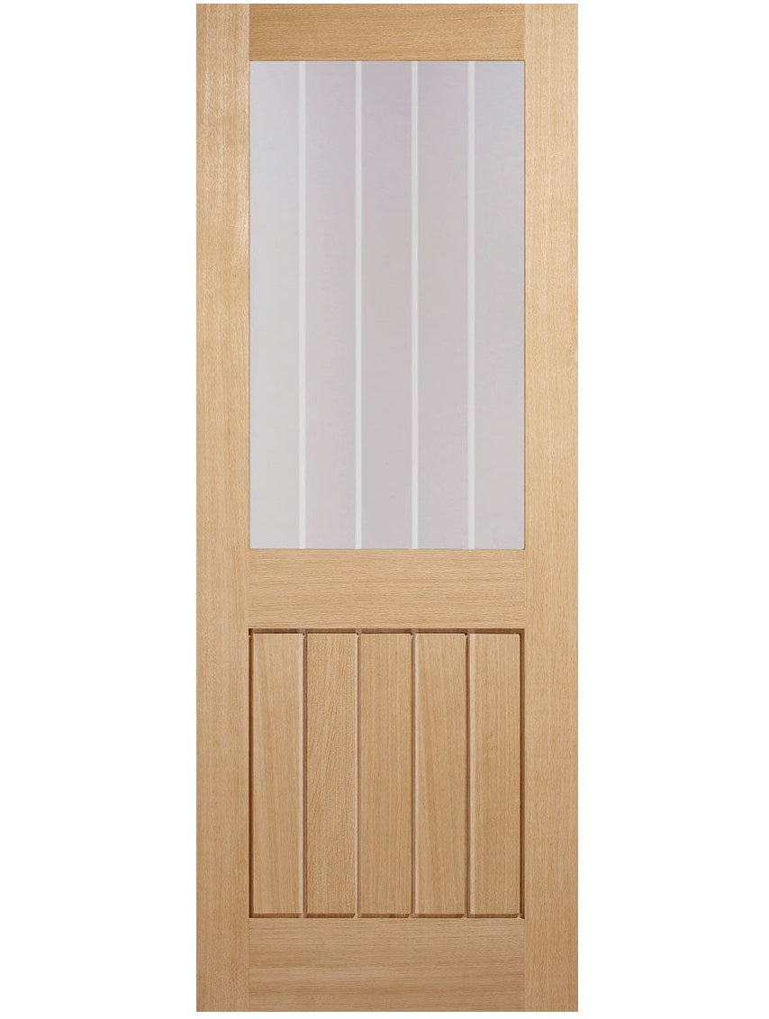 The LPD Mexicano Half Light Glazed Oak Internal Door. A distinctive twist on the timeless Mexicano design. This modern door features a glazed panel with clear glass adorned with frosted lines, mirroring the solid panel below in the traditional Mexicano style. Supplied fully finished and ready to hang, this FD30 fire door provides a minimum of 30 minutes of fire resistance, effectively limiting the spread of flames within your property in the event of a fire. Its solid core construction also ensures exceptional durability and insulation.