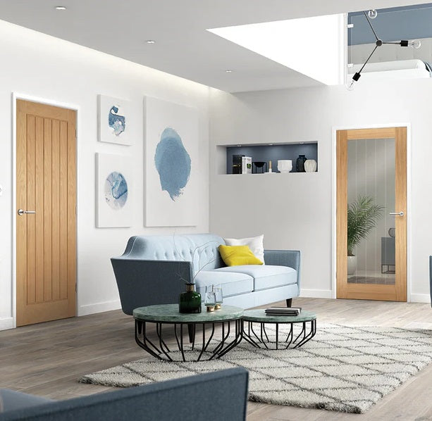 The LPD Mexicano Pattern 10 Glazed Oak FD30 Fire Door. A stylish new addition to the beloved LPD Mexicano range. This door features a sizable clear glazed panel with frosted lines, echoing the iconic Mexicano design. Pre-finished and ready to hang, this door is perfect for rooms seeking to enhance natural light flow while maintaining a touch of elegance. Supplied fully finished and ready to hang, this FD30 fire door provides a minimum of 30 minutes of fire resistance, effectively limiting the spread of flames within your property in the event of a fire. Its solid core construction also ensures exceptional durability and insulation.