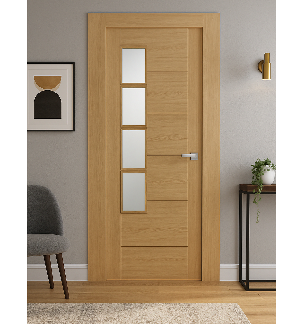 The Mendes Iseo Deluxe Quarter Cut Offset 4 Light FD30 Fire Door comes pre-finished and ready to hang, making installation quick and simple. A popular favourite, the Oak Iseo Deluxe combines a solid engineered core with a refined closed-pore finish, truly living up to its Deluxe name. Each door is fitted with clear glazing as standard, though bespoke glazing options are also available on request.