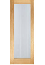 LPD Mexicano Pattern 10 Glazed Oak Internal Door. A stylish new addition to the beloved LPD Mexicano range. This door features a sizable clear glazed panel with frosted lines, echoing the iconic Mexicano design. Pre-finished and ready to hang, this door is perfect for rooms seeking to enhance natural light flow while maintaining a touch of elegance.