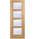 The LPD Vancouver Pre-Finished Oak 4 Light Glazed Internal Door is a ready-to-install interior door featuring four sizable clear glass panels and raised molding on each side. Already finished, this door enhances your home's interior with natural light and boasts a chic oak wood grain design that complements any contemporary dwelling.