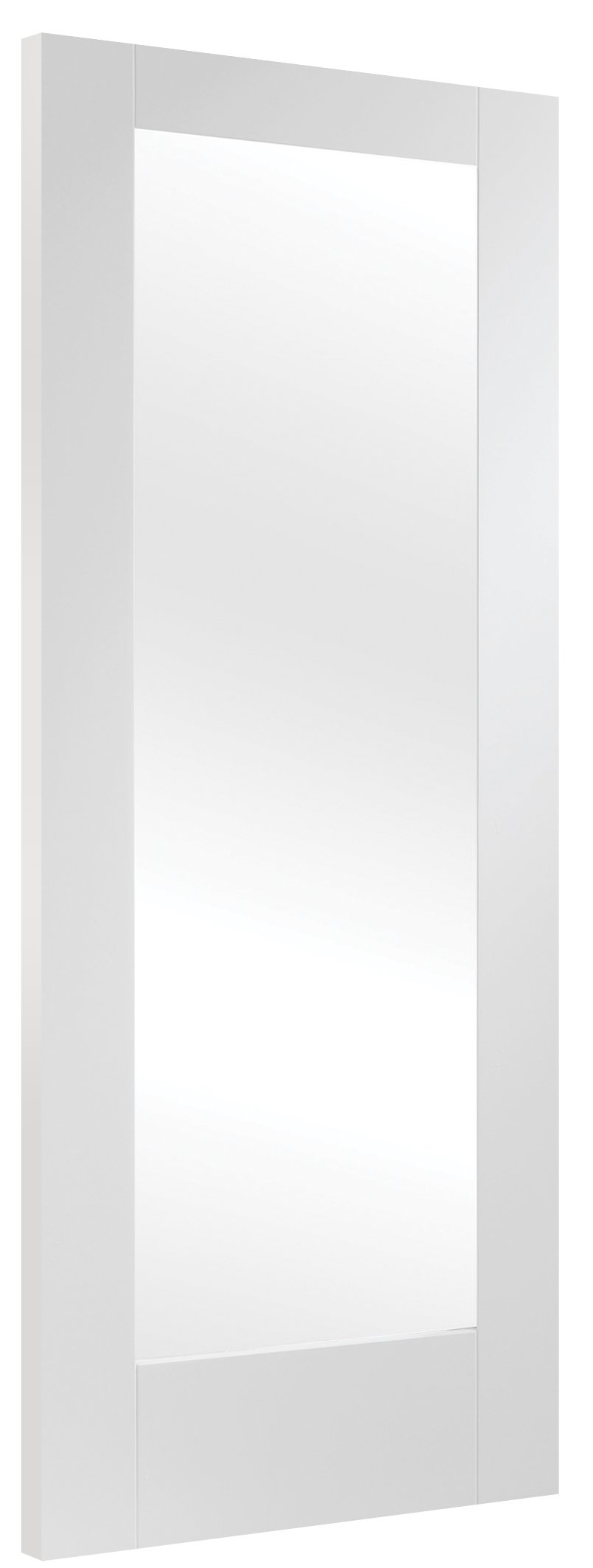 The XL Joinery Pattern 10 Clear Glazed White Primed FD30 Fire Door. This glazed version of the Pattern 10 features a large central pane of clear glass, allowing natural light to flow freely between rooms. Its simple yet elegant design makes it a versatile choice that complements not only the rest of the Pattern 10 range but also any other white primed internal doors.