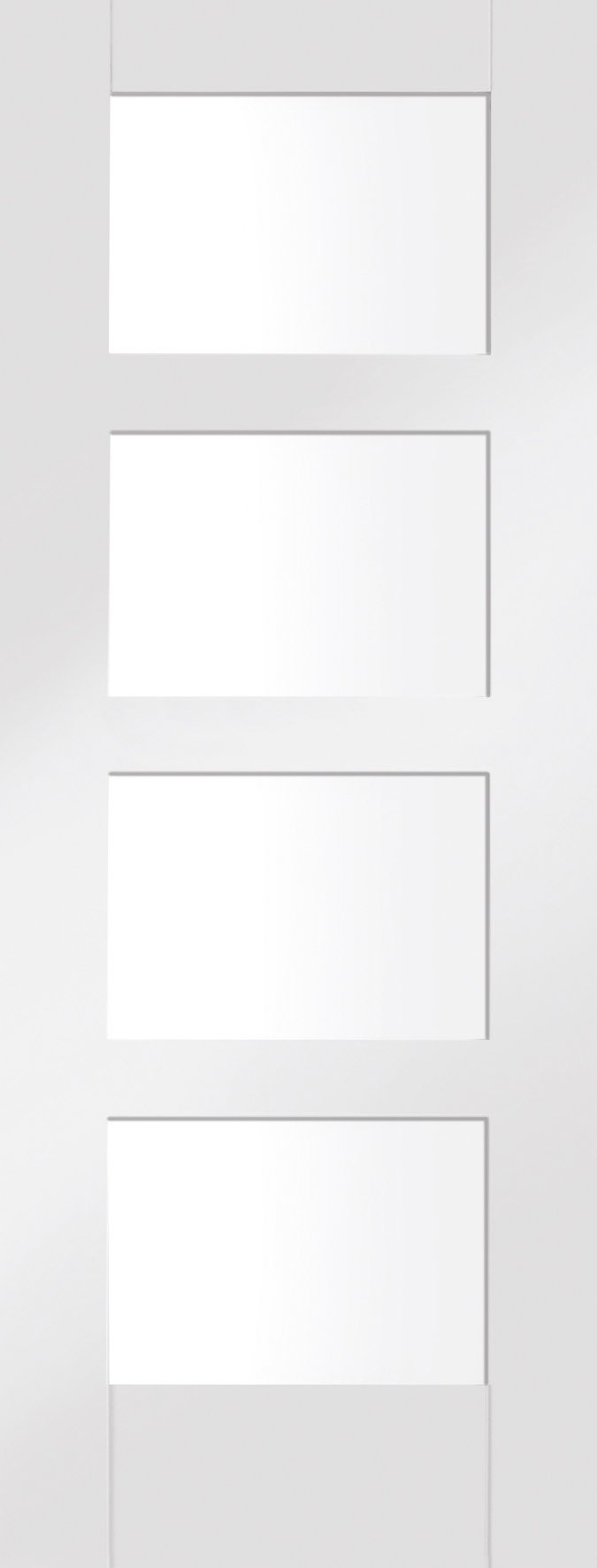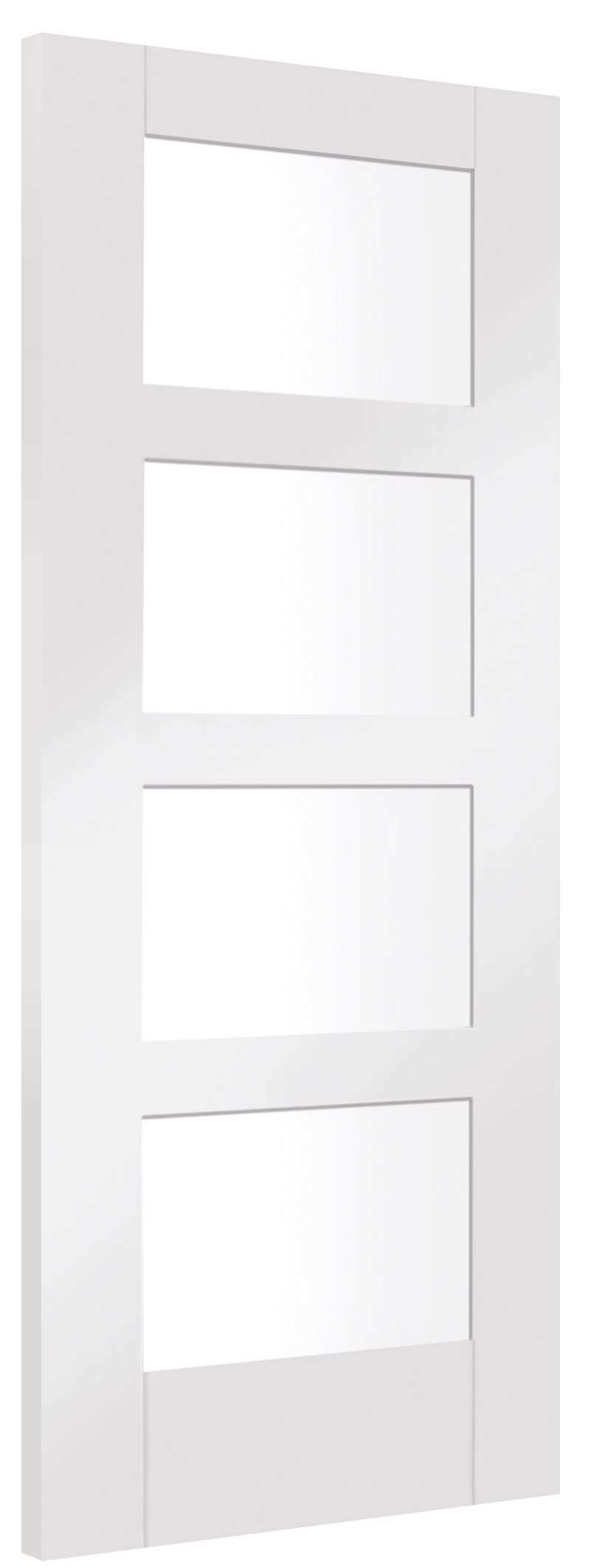 The XL Joinery Shaker 4 Panel Clear Glazed White Primed FD30 Fire Door is part of XL Joinery’s White Collection, seamlessly combining modern simplicity with timeless traditional design. Combining a classic shaker design with clear glass gives the Shaker door a real timeless look that complements any home. The clear glass allows for light to pass seamlessly between rooms to enable darker rooms to benefit from natural daylight. Supporting panelled, and fire doors complement this range.