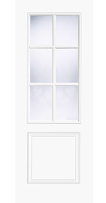- Style: A characteristic interior door design featuring six clear glazed panels above one large solid panel