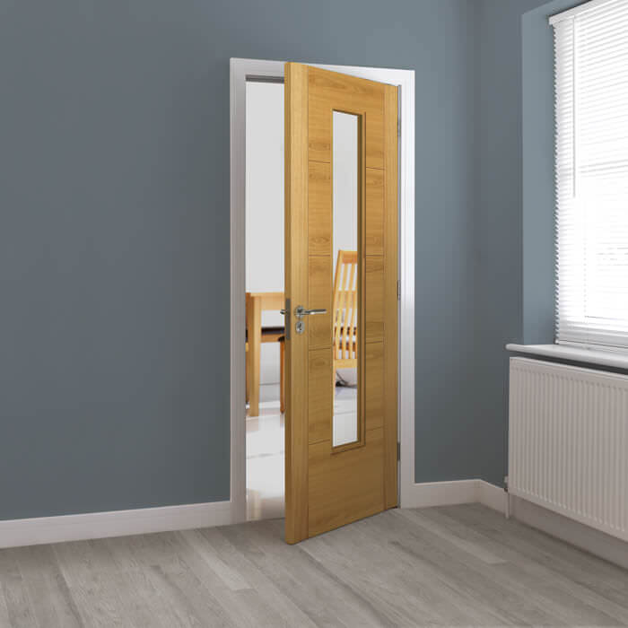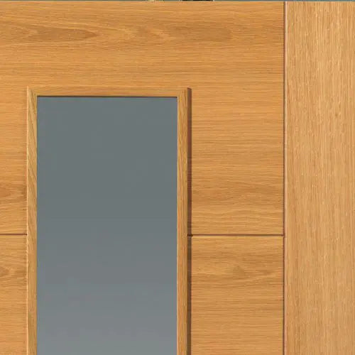 - Style: Real oak veneered internal door with clear flat fire glass panel and raised beading