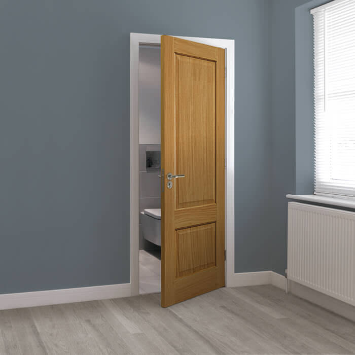 The JB Kind Trent Oak Veneered Internal Door is a traditional style oak internal door with two rasied panels, supplied ready for a varnish finish..
