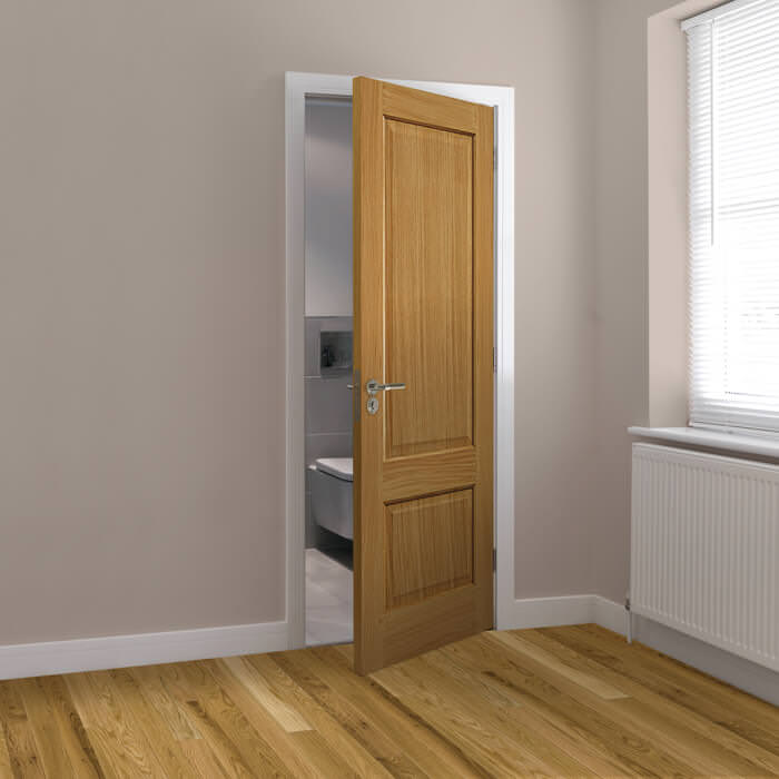 Made with a solid core construction, the Trent features two raised shaped panels. The real oak veneered finish and grooved panels will make a beautiful addition to any room of your home.