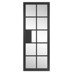 The JB Kind Plaza Glazed Black Industrial Style Internal Door exudes contemporary industrial sophistication with its sleek black design and captivating recessed panels. featuring clear flat safety glass, constructed with individual panes of glass for added stability.