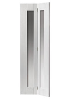 The JB Kind Axis Glazed White Primed Shaker Style Bi-Fold Door. Discover the elegance of our white shaker-style internal bi-fold door, featuring clear glass panels for a contemporary touch. A modern wide shaker style white interior bi-fold door, supplied ready primed with clear glass. Matching standard door available.