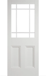 The LPD Downham Unglazed White Primed Internal Door, once glazed features an primed white and nine piece glazed panels with decorative blue corners. NB: The Glass pack is sold separately.