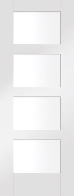 The XL Joinery Shaker 4 Panel Clear Glazed White Primed Internal Door is part of XL Joinery’s White Collection, seamlessly combining modern simplicity with timeless traditional design. Combining a classic shaker design with clear glass gives the Shaker door a real timeless look that complements any home. The clear glass allows for light to pass seamlessly between rooms to enable darker rooms to benefit from natural daylight. Supporting panelled, and fire doors complement this range.