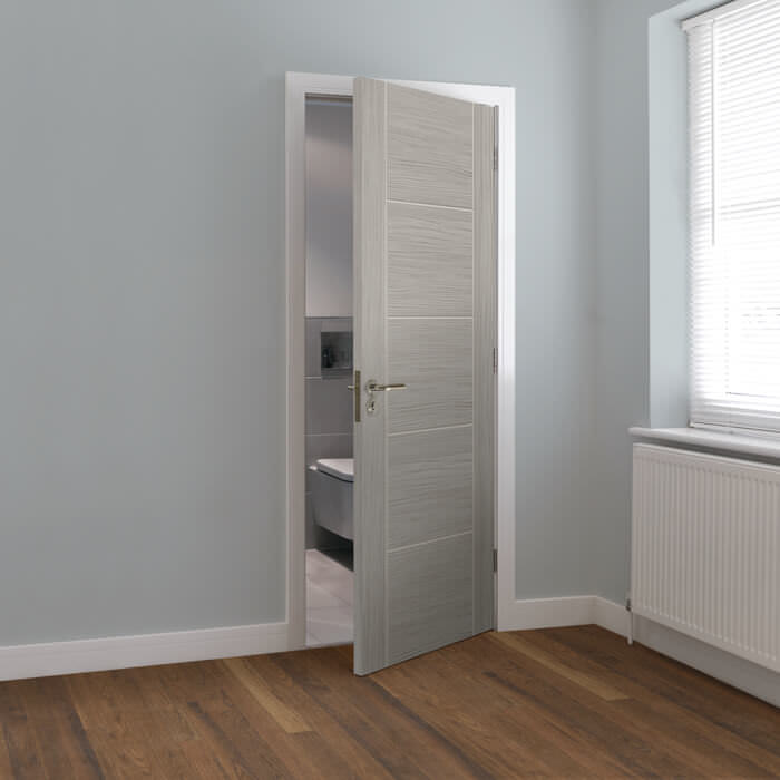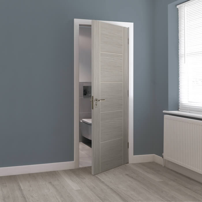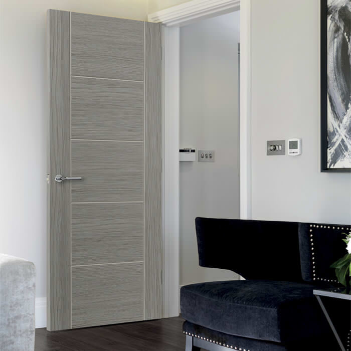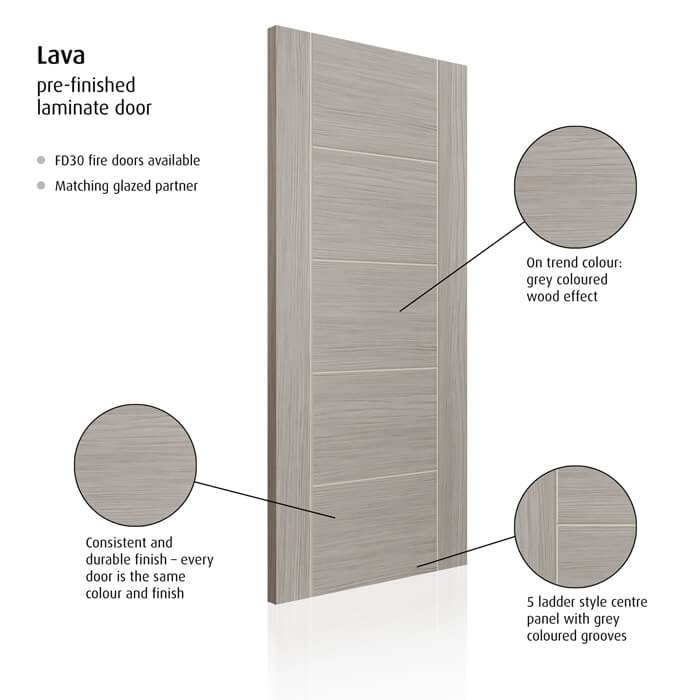 The Tigris 5 Panel Lava Pre-Finished Grey Laminate Internal Door by JB Kind epitomizes modern interior design, featuring a sleek 5 panel ladder-style design ideal for contemporary residences such as homes, flats, and apartments. With its semi-solid core construction and pre-finished surface, this door boasts both durability and style. Its wood-effect finish adds a touch of natural elegance to any room, making it a versatile choice for interior decor.