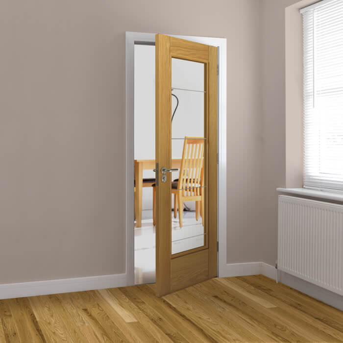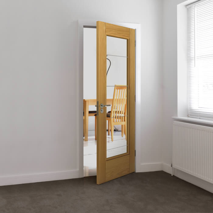 The JB Kind Tigris Oak Full Glazed Internal Door is a desirable and modern real oak veneered interior door with clear diamond cut glass for any contemporary home. Supplied fully finished with high quality varnish, the Medina will bring natural light into your interiors and also comes with attractive raised beading to complete the look.