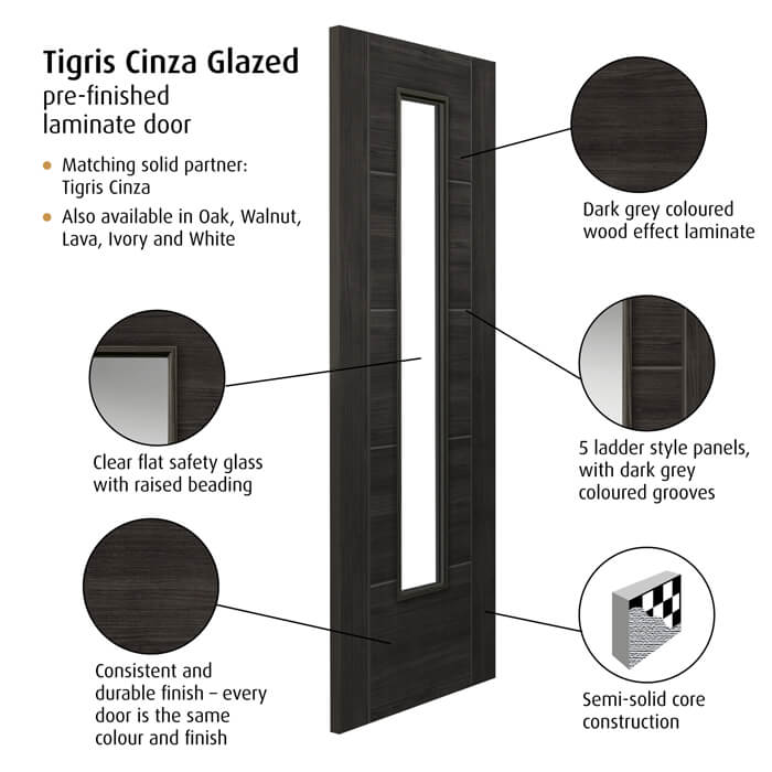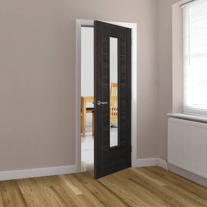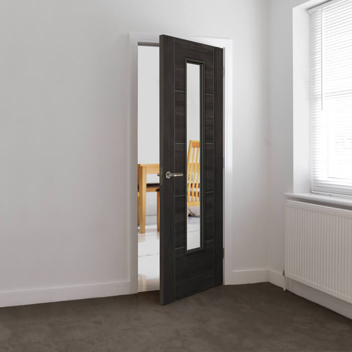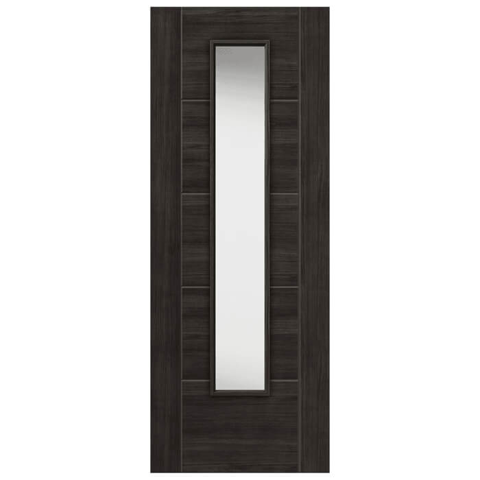 The JB Kind Tigris 1 Light Dark Grey Glazed Laminate Internal Door presents a contemporary solution for modern living spaces and sleek home designs. Crafted with a semi-solid core construction and delivered fully finished, this laminate internal door boasts a sophisticated appearance. Its distinctive features include a grooved panel wood-effect finish and flat safety glass adorned with raised beading.