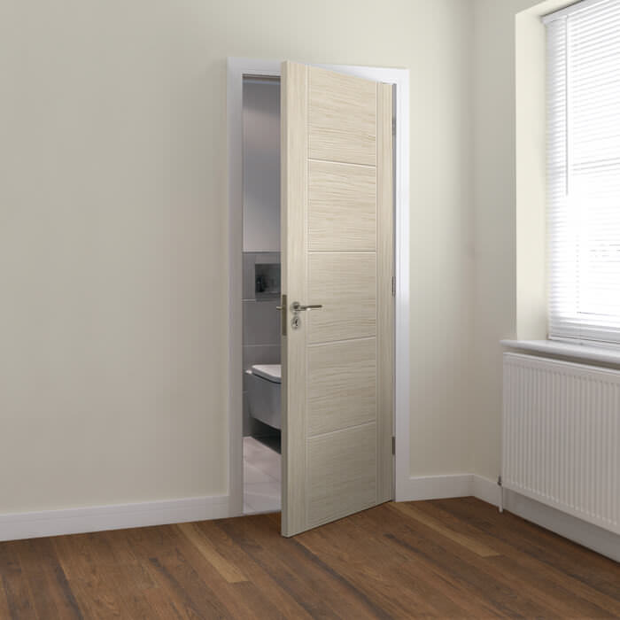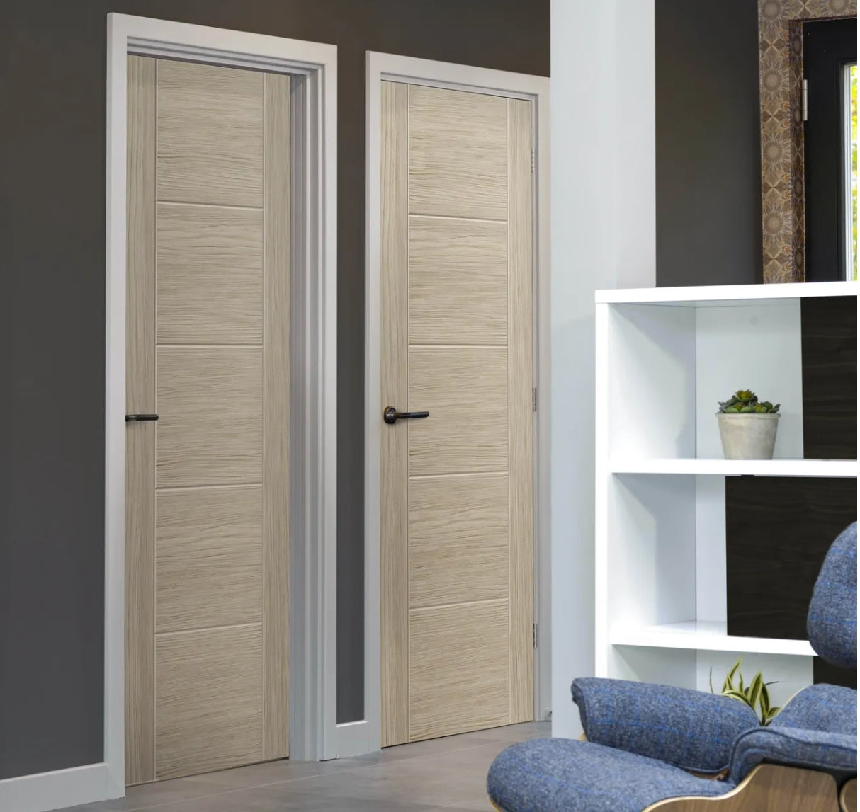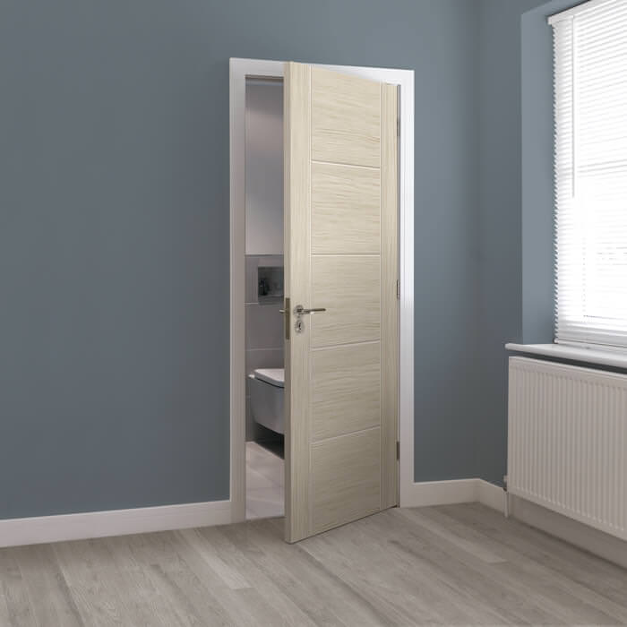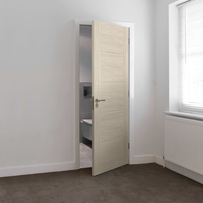 Introducing the JB Kind Tigris Ivory Internal Door. Featuring a contemporary laminate design with an ivory-colored wood effect and five ladder-style panels accented with light-colored grooves. Its consistent finish makes it perfect for seamless coordination. With a Semi-solid core construction, it stands as one of the most economical choices available.