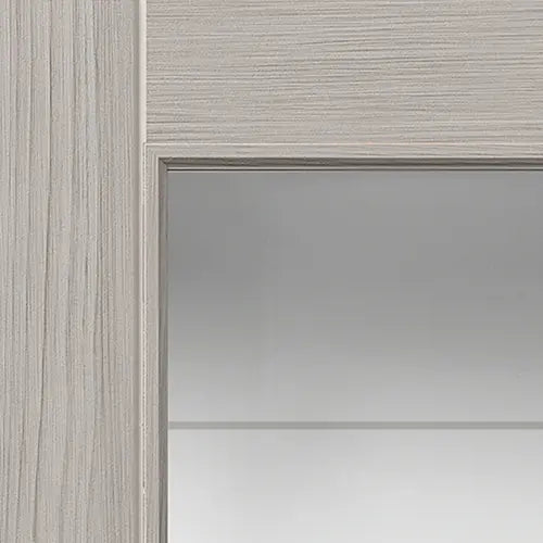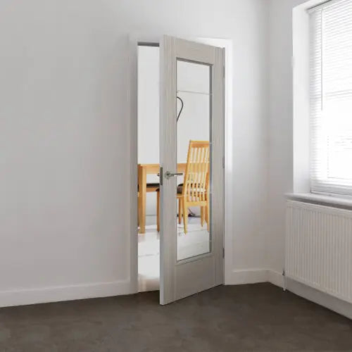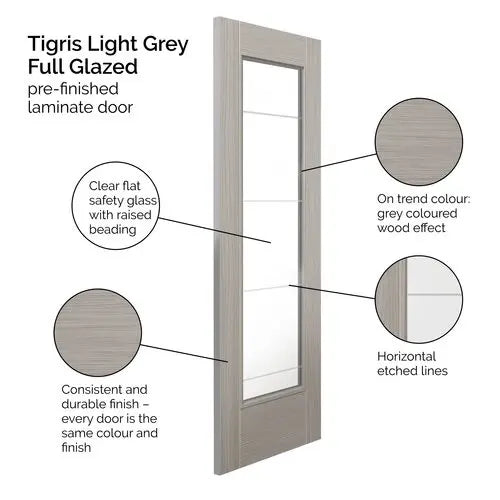 The JB Kind Tigris Light Grey Full Glazed Grey Laminate Internal Door presents a contemporary solution for modern living spaces and sleek home designs. Crafted with a semi-solid core construction and delivered fully finished, this laminate internal door boasts a sophisticated appearance. Its distinctive features include a grooved panel wood-effect finish and flat safety glass adorned with raised beading.