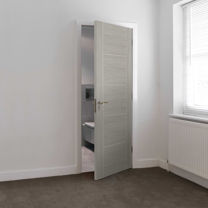 The Tigris 5 Panel Lava Pre-Finished Grey Laminate Internal Door by JB Kind epitomizes modern interior design, featuring a sleek 5 panel ladder-style design ideal for contemporary residences such as homes, flats, and apartments. With its semi-solid core construction and pre-finished surface, this door boasts both durability and style. Its wood-effect finish adds a touch of natural elegance to any room, making it a versatile choice for interior decor.