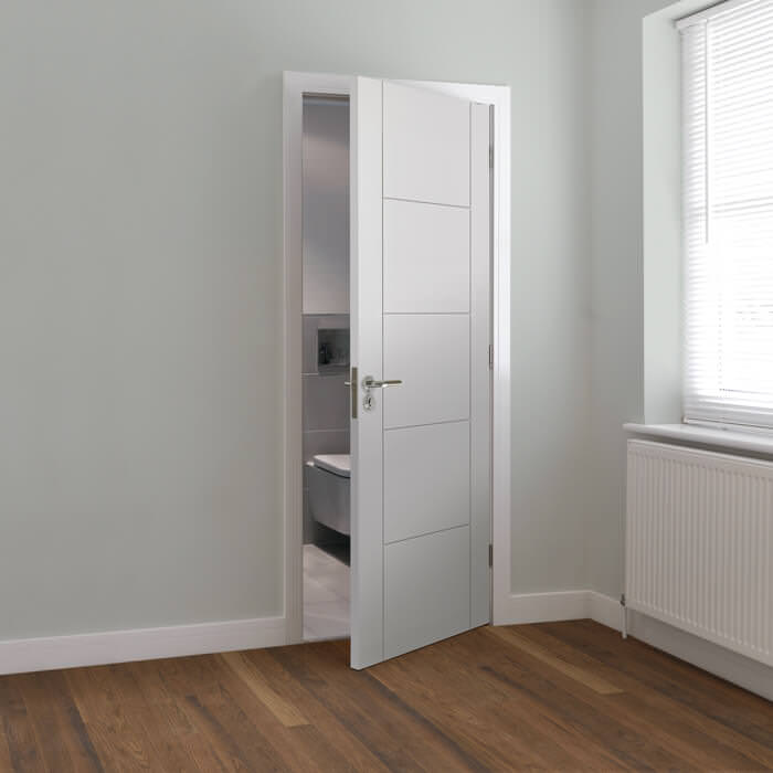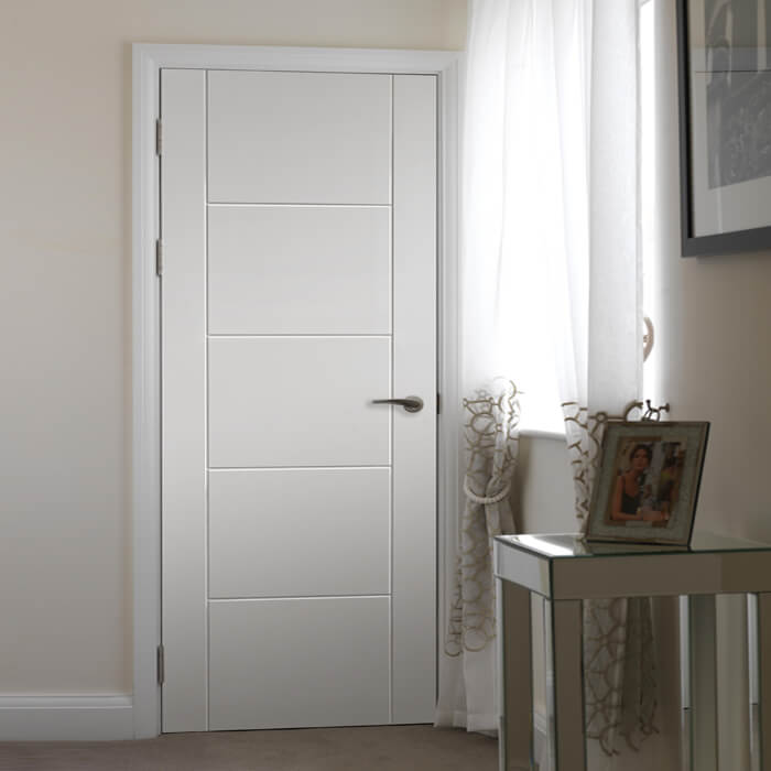 The JB Kind Tigris 5 Panel Pre-Finished White Internal Door offers a sleek and contemporary option for any modern home, flat, or apartment. With its fully finished design, this standard internal door is ready to be installed and instantly enhances the look of any interior space with its smart and stylish grooved panel effect.