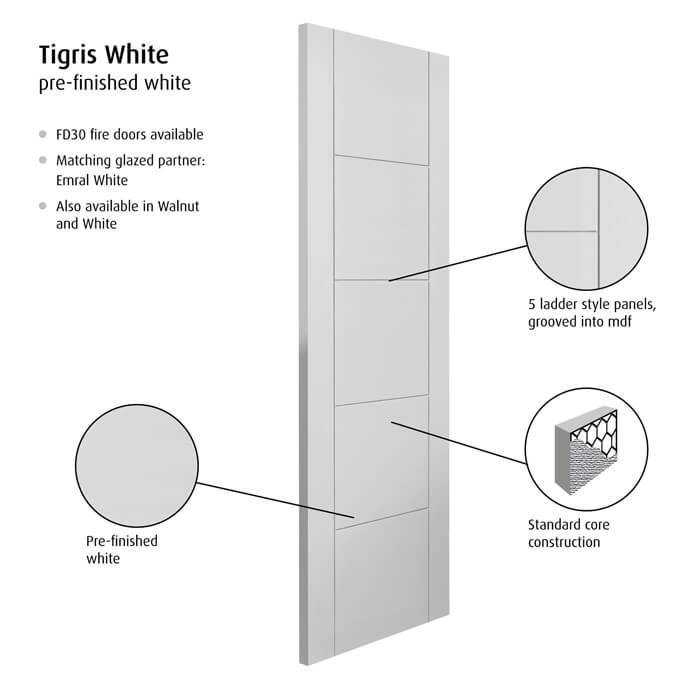 The JB Kind Tigris White Painted 5 Panel FD30 Fire Door is supplied Fully fiinished. All JB Kind fire doors are fully accredited and tested in accordance with either BS 476 pt22 or EN1634-1:2000.