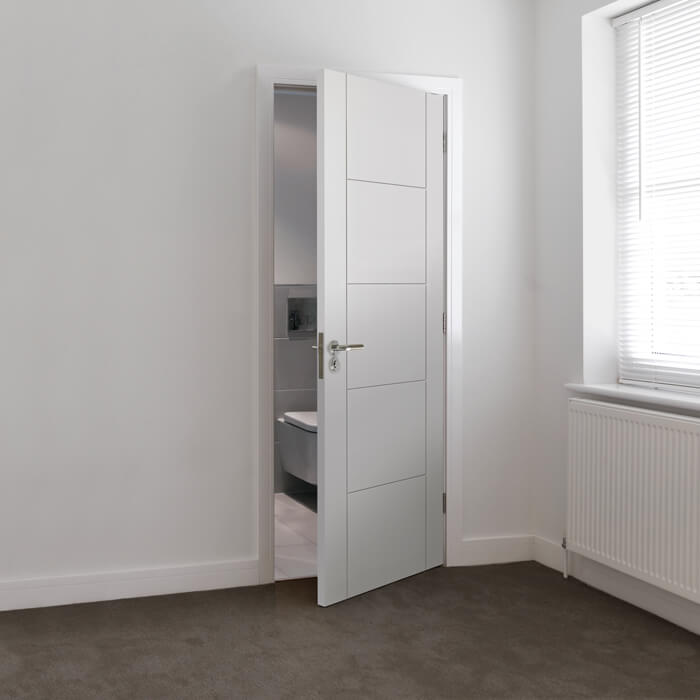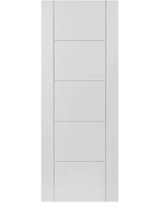 The JB Kind Tigris 5 Panel Pre-Finished White Internal Door offers a sleek and contemporary option for any modern home, flat, or apartment. With its fully finished design, this standard internal door is ready to be installed and instantly enhances the look of any interior space with its smart and stylish grooved panel effect.
