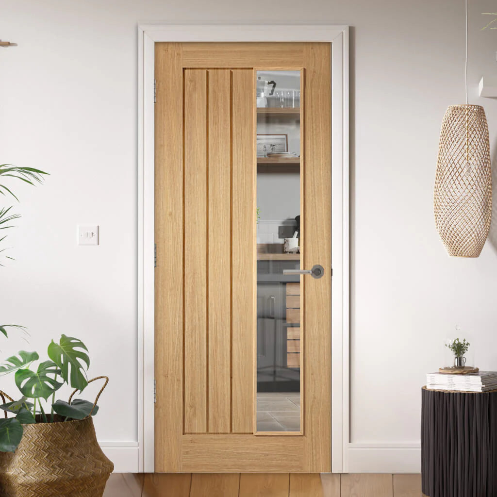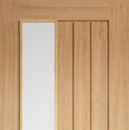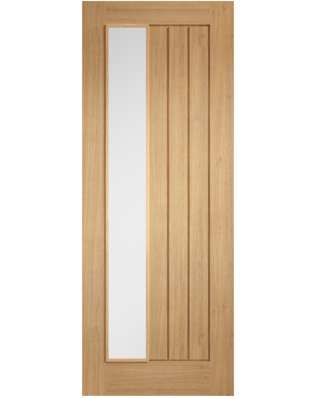 The LPD Mexicano Clear Glazed Offset Oak Internal Door offers a fantastic way to enhance your living environment by blending classic Cottage door style with contemporary design. Fully finished in quality oak veneer, this door features a striking offset design with a long clear glazed panel embellished with square-cut vertical grooves, making it a captivating focal point in any room.