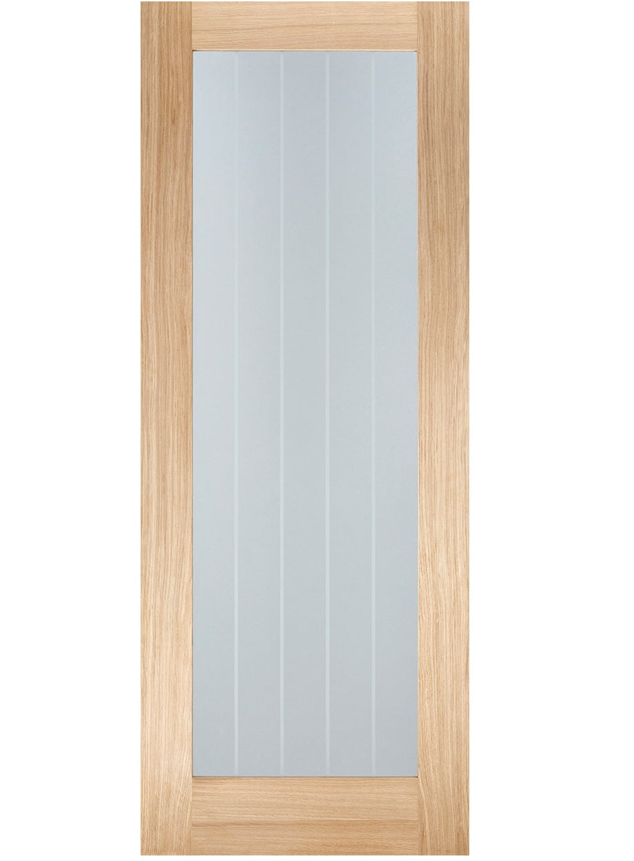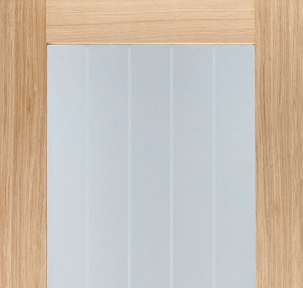LPD Mexicano Pattern 10 Glazed Oak Internal Door. A stylish new addition to the beloved LPD Mexicano range. This door features a sizable clear glazed panel with frosted lines, echoing the iconic Mexicano design. Unfinished and ready for your choice of stain or varnish, this door is perfect for rooms seeking to enhance natural light flow while maintaining a touch of elegance.