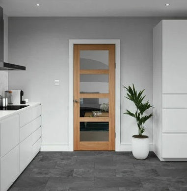 The LPD Shaker Style 4 Light Oak Internal Door is delivered pre-finished and ready for installation. Featuring four equally sized clear glazed panels, it offers a contemporary touch, ideal for dividing rooms in your home, such as the living area from the kitchen.
