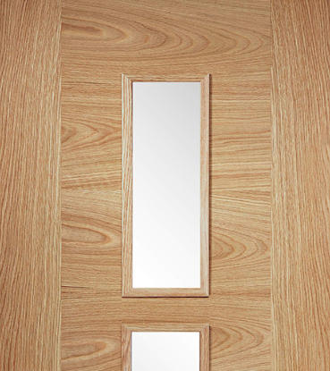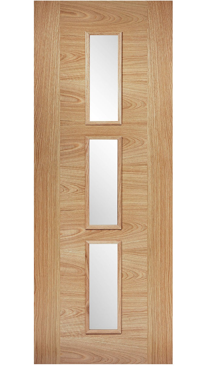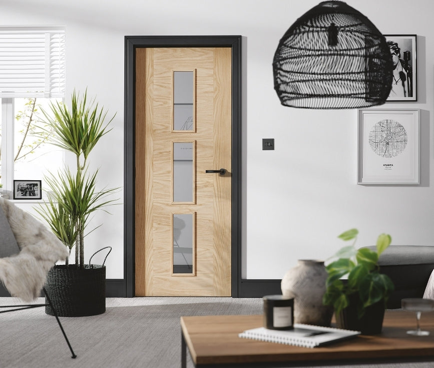 The LPD Sofia Oak Glazed Prefinished Internal Door possesses a distinctive capability, especially when paired with its unglazed counterpart, the Sofia Oak Prefinished Door, to seamlessly unify a room's decor. Featuring three glazed panels that allow light to flow between rooms, it enhances the brightness and spaciousness of your home. Finished with a clear lacquer during manufacturing, this door ensures a consistent and flawless appearance, ready for immediate hanging. Crafted from premium materials such as engineered oak and toughened safety glass, it exemplifies durability and quality.
