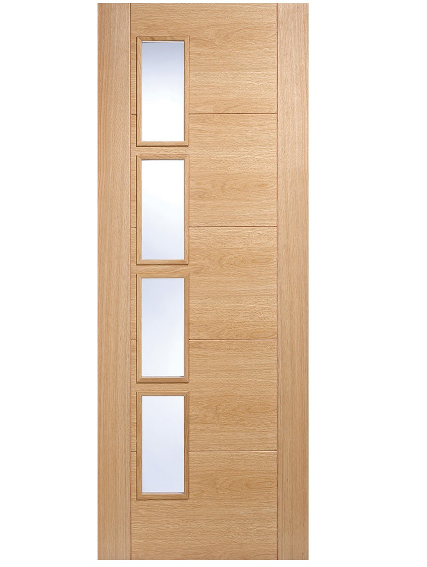 The LPD Vancouver Pre-Finished Oak Offset 4 Light Glazed Internal Door presents a contemporary aesthetic with its distinctive offset clear glass panels, offering a unique touch to modern interiors. Supplied pre-finished, the Vancouver door is an excellent choice for infusing your house or apartment with natural light and effortless sophistication.