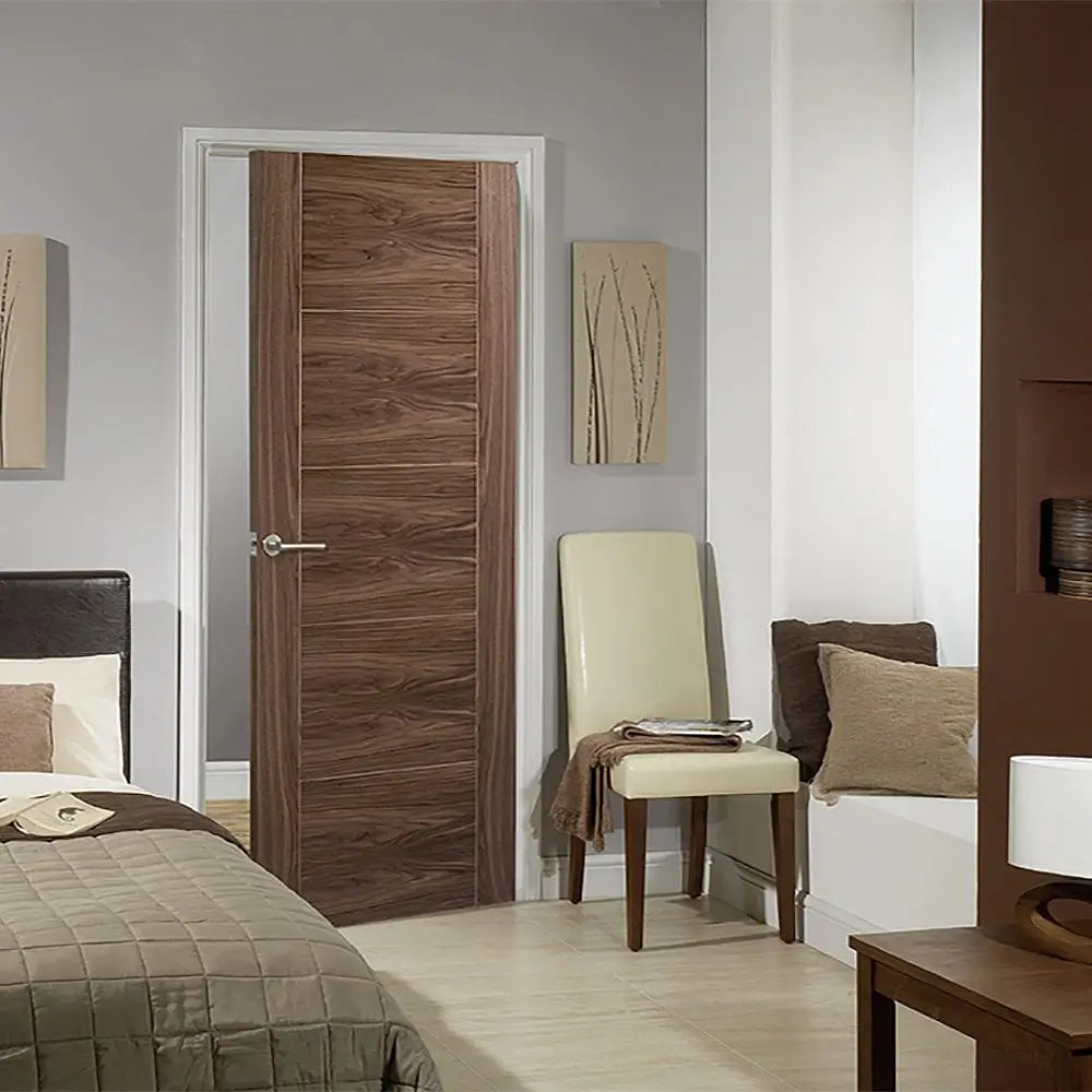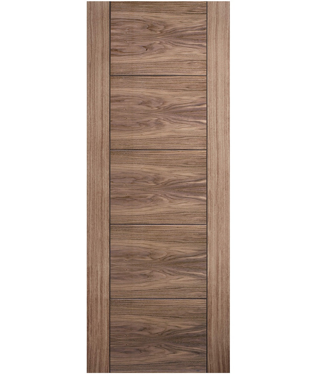 The LPD Vancouver Walnut 5 Panel FD30 Fire Door comes pre-finished in a luxurious Walnut colour. Its design, featuring five centre panels, creates an attractive ladder-style effect. These panels showcase a distinctive pre-finished Stained Oak wood grain, providing a modern touch ideal for contemporary living spaces. Light wood inlays accentuate the ladder-style panels at the centre of this Vancouver door design, crafted from beautiful pre-finished Walnut.