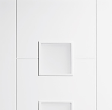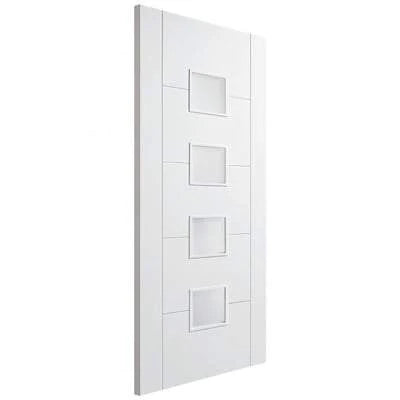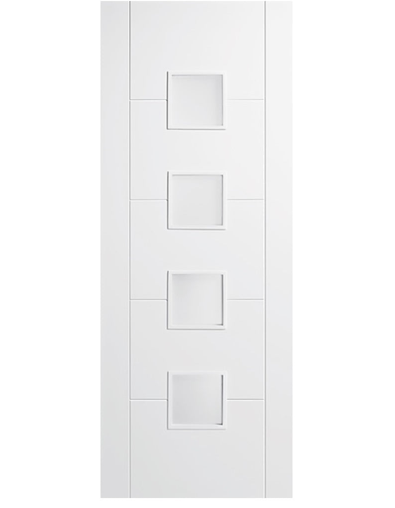 The LPD Vancouver White Primed 4 Light Frosted Glazed Internal Door features four frosted glazed panels set between grooved panels. With raised moulding on both sides and a primed semi-solid core in white, this door combines elegance with practicality.
